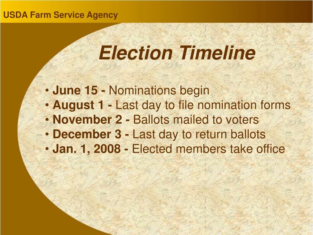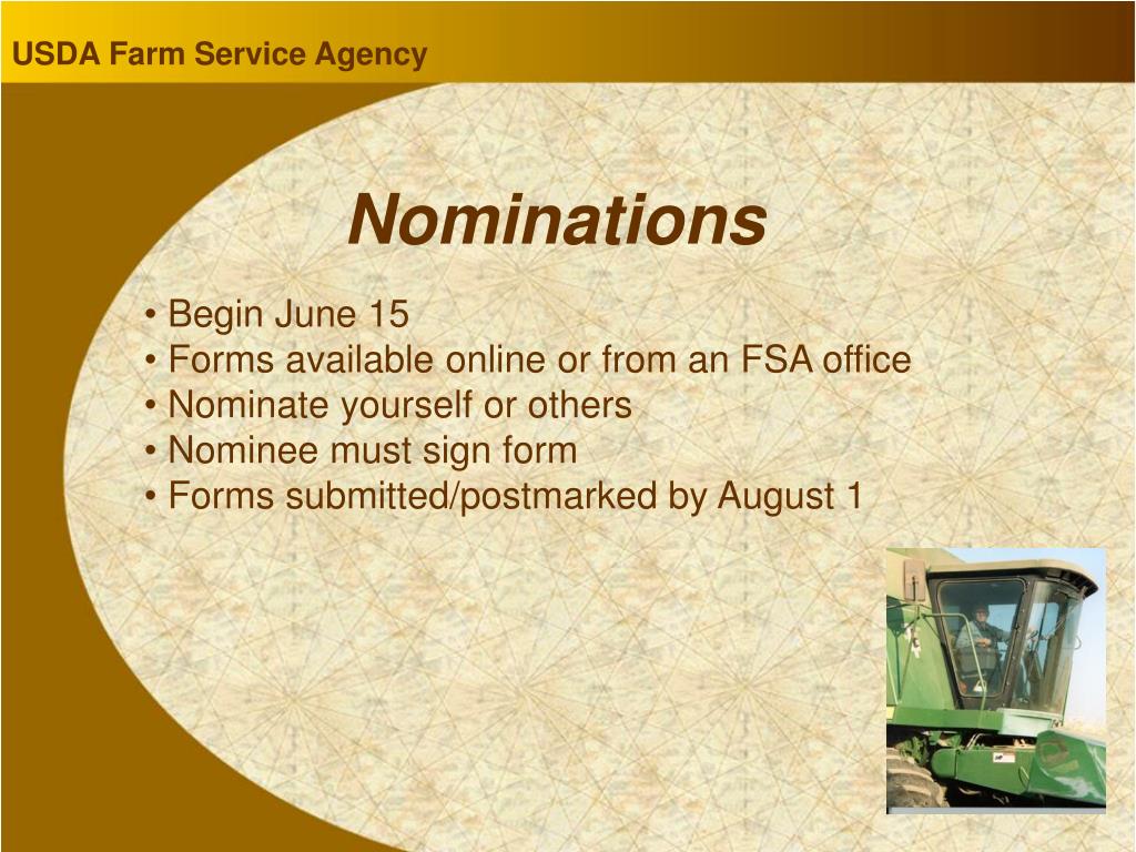 Nominations • Begin June 15 • Forms available online or from an FSA office • Nominate yourself or others • Nominee must sign form • Forms submitted/postmarked by August 1