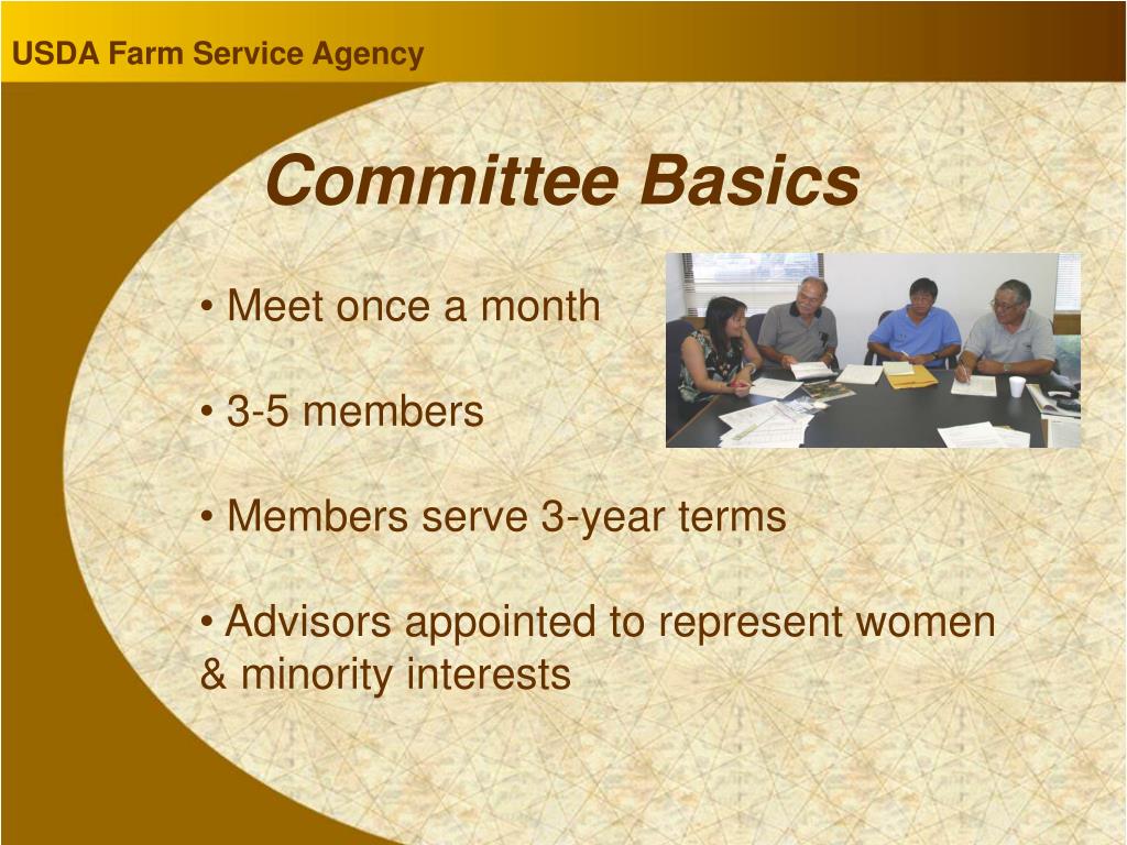 Advisors • Recommended by county committee or community-based organization • Appointed by FSA state committee • Give voice to minority and women producers