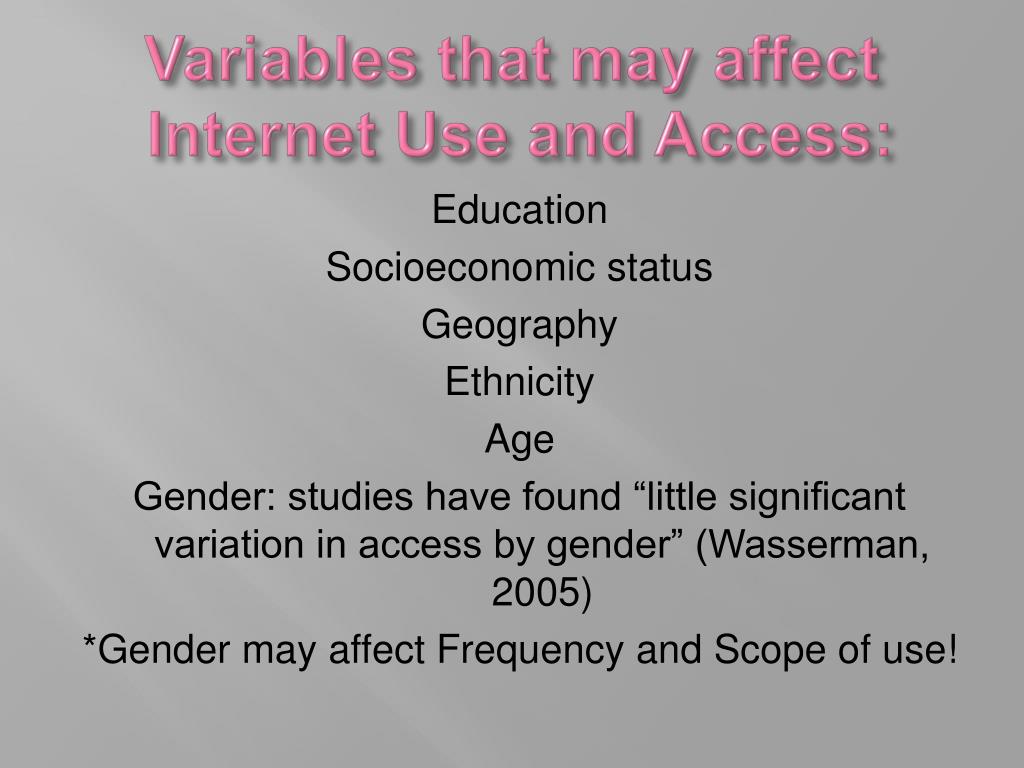 Variables that may affect Internet Use and Access: Education Socioeconomic status Geography Ethnicity Age Gender: studies have found “little significant variation in access by gender” (Wasserman, 2005) *Gender may affect Frequency and Scope of use!