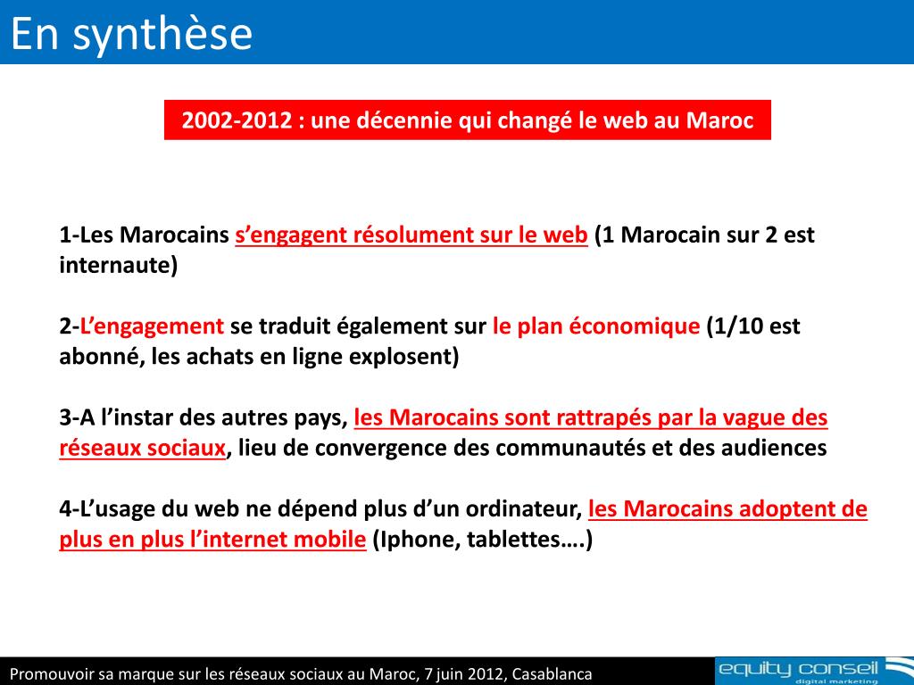 En synthèse 2002-2012 : une décennie qui changé le web au Maroc 1-Les Marocains s’engagent résolument sur le web(1 Marocain sur 2 est internaute) 2-L’engagement se traduit également sur le plan économique (1/10 est abonné, les achats en ligne explosent) 3-A l’instar des autres pays, les Marocains sont rattrapés par la vague des réseaux sociaux, lieu de convergence des communautés et des audiences 4-L’usage du web ne dépend plus d’un ordinateur, les Marocains adoptent de plus en plus l’internet mobile (Iphone, tablettes….) E-réputation & personalbranding, 5 avril 2012 Promouvoir sa marque sur les réseaux sociaux au Maroc, 7juin 2012, Casablanca Promouvoir sa marque sur les réseaux sociaux au Maroc, 7juin 2012, Casablanca