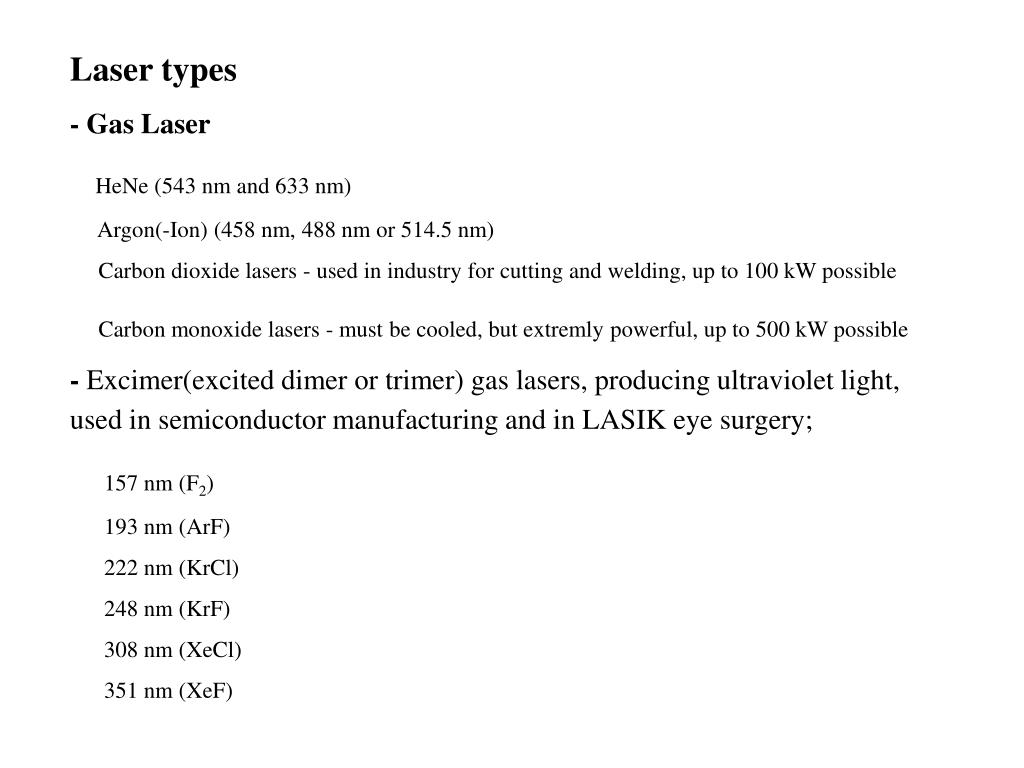 Laser types - Gas Laser HeNe (543 nm and 633 nm) Argon(-Ion) (458 nm, 488 nm or 514.5 nm) Carbon dioxide lasers - used in industry for cutting and welding, up to 100 kW possible Carbon monoxide lasers - must be cooled, but extremly powerful, up to 500 kW possible - Excimer(excited dimer or trimer) gas lasers, producing ultraviolet light, used in semiconductor manufacturing and in LASIK eye surgery; 157 nm (F2) 193 nm (ArF) 222 nm (KrCl) 248 nm (KrF) 308 nm (XeCl) 351 nm (XeF)