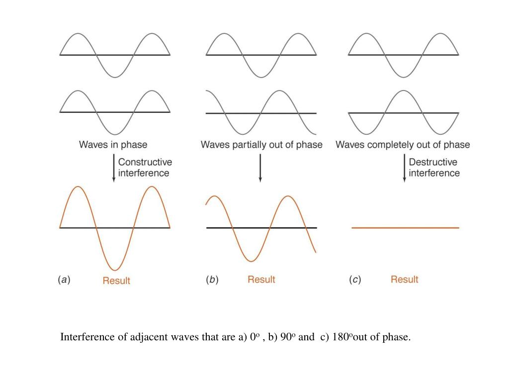 Interference of adjacent waves that are a) 0o , b) 90o and c) 180oout of phase.