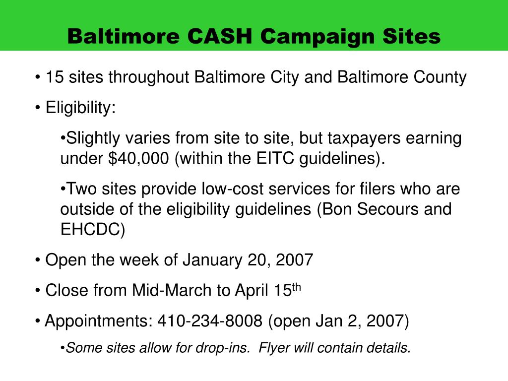 Baltimore CASH Campaign Sites • 15 sites throughout Baltimore City and Baltimore County • Eligibility: • Slightly varies from site to site, but taxpayers earning under $40,000 (within the EITC guidelines). • Two sites provide low-cost services for filers who are outside of the eligibility guidelines (Bon Secours and EHCDC) • Open the week of January 20, 2007 • Close from Mid-March to April 15th • Appointments: 410-234-8008 (open Jan 2, 2007) • Some sites allow for drop-ins. Flyer will contain details.