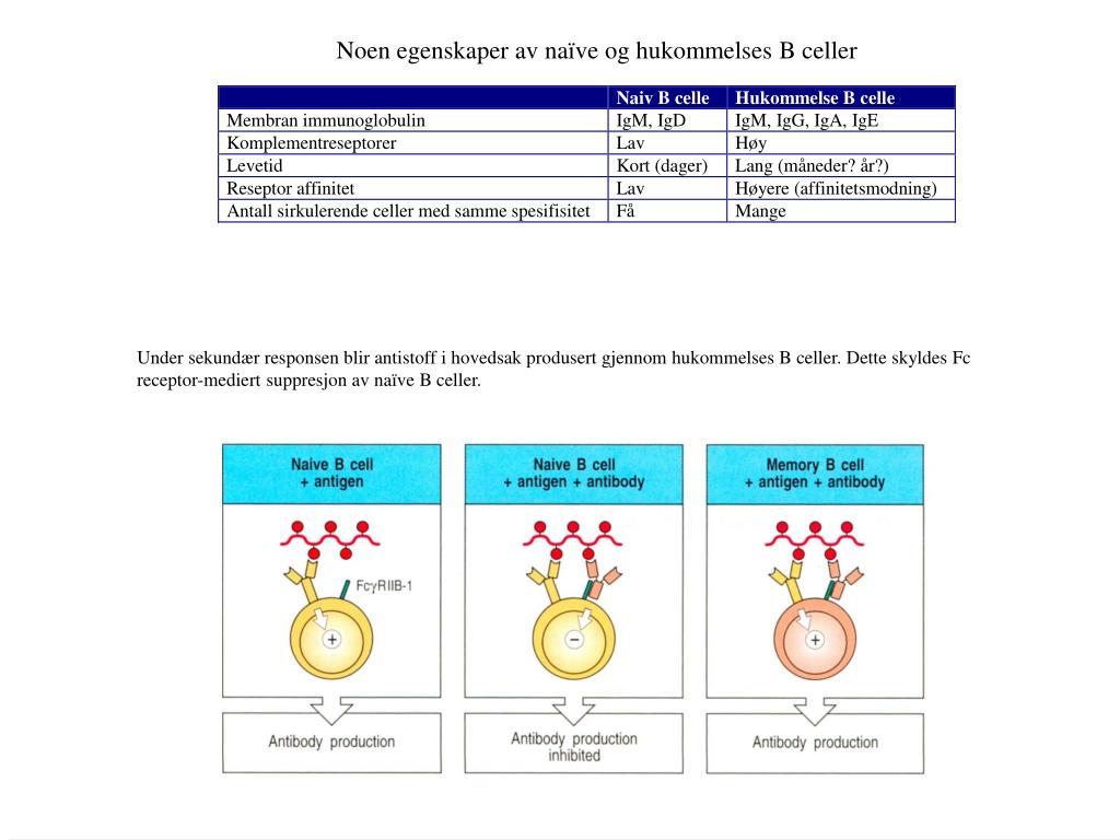 Noen egenskaper av naïve og hukommelses B celler Under sekundær responsen blir antistoff i hovedsak produsert gjennom hukommelses B celler. Dette skyldes Fc receptor-mediert suppresjon av naïve B celler.