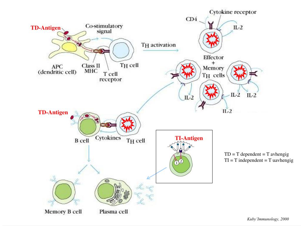 TD-Antigen TI-Antigen TD-Antigen TD = T dependent = T avhengig TI = T independent = T uavhengig Kuby’Immunology, 2000