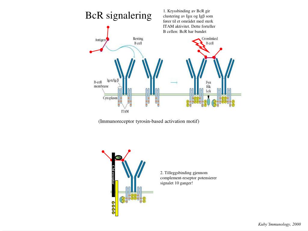 C3d receptor C3d P P P P (Immunoreceptor tyrosin-based activation motif) 1. Kryssbinding av BcR gir clustering av Iga og Igb som fører til et området med sterk ITAM aktivitet. Dette forteller B cellen: BcR har bundet antigen! BcR signalering 2. Tilleggsbinding gjennom complement-reseptor potensierer signalet 10 ganger! Kuby’Immunology, 2000
