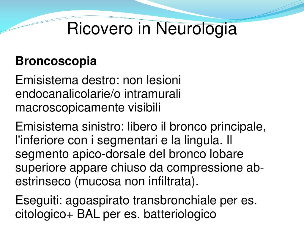 Ricovero in Neurologia Broncoscopia Emisistema destro: non lesioni endocanalicolarie/o intramurali macroscopicamente visibili Emisistema sinistro: libero il bronco principale, l'inferiore con i segmentari e la lingula. Il segmento apico-dorsale del bronco lobare superiore appare chiuso da compressione ab-estrinseco (mucosa non infiltrata). Eseguiti: agoaspirato transbronchiale per es. citologico+ BAL per es. batteriologico