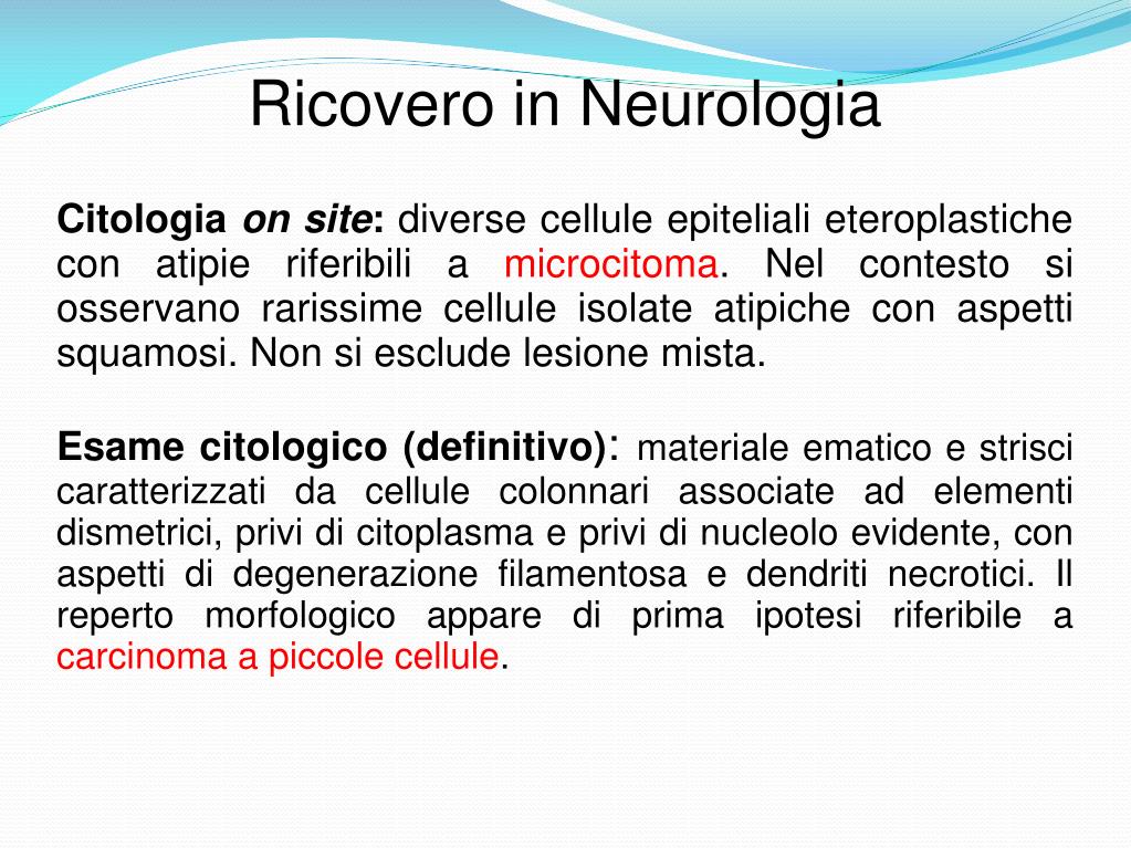 Ricovero in Neurologia Citologia on site: diverse cellule epiteliali eteroplastiche con atipie riferibili a microcitoma. Nel contesto si osservano rarissime cellule isolate atipiche con aspetti squamosi. Non si esclude lesione mista. Esame citologico (definitivo): materiale ematico e strisci caratterizzati da cellule colonnari associate ad elementi dismetrici, privi di citoplasma e privi di nucleolo evidente, con aspetti di degenerazione filamentosa e dendriti necrotici. Il reperto morfologico appare di prima ipotesi riferibile a carcinoma a piccole cellule.