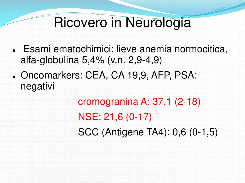 Ricovero in Neurologia • Esami ematochimici: lieve anemia normocitica, alfa-globulina 5,4% (v.n. 2,9-4,9) • Oncomarkers: CEA, CA 19,9, AFP, PSA: negativi cromogranina A: 37,1 (2-18) NSE: 21,6 (0-17) SCC (Antigene TA4): 0,6 (0-1,5)