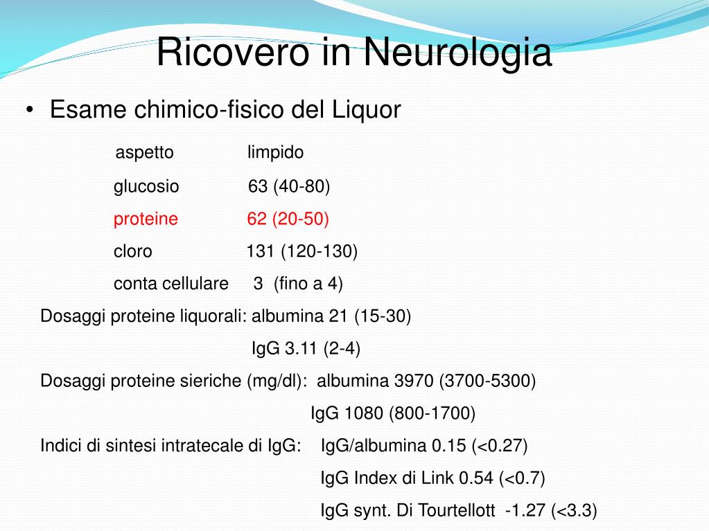 Ricovero in Neurologia • Esame chimico-fisico del Liquor aspetto limpido glucosio 63 (40-80) proteine 62 (20-50) cloro 131 (120-130) conta cellulare 3 (fino a 4) Dosaggi proteine liquorali: albumina 21 (15-30) IgG 3.11 (2-4) Dosaggi proteine sieriche (mg/dl): albumina 3970 (3700-5300) IgG 1080 (800-1700) Indici di sintesi intratecale di IgG: IgG/albumina 0.15 (<0.27) IgG Index di Link 0.54 (<0.7) IgG synt. Di Tourtellott -1.27 (<3.3)
