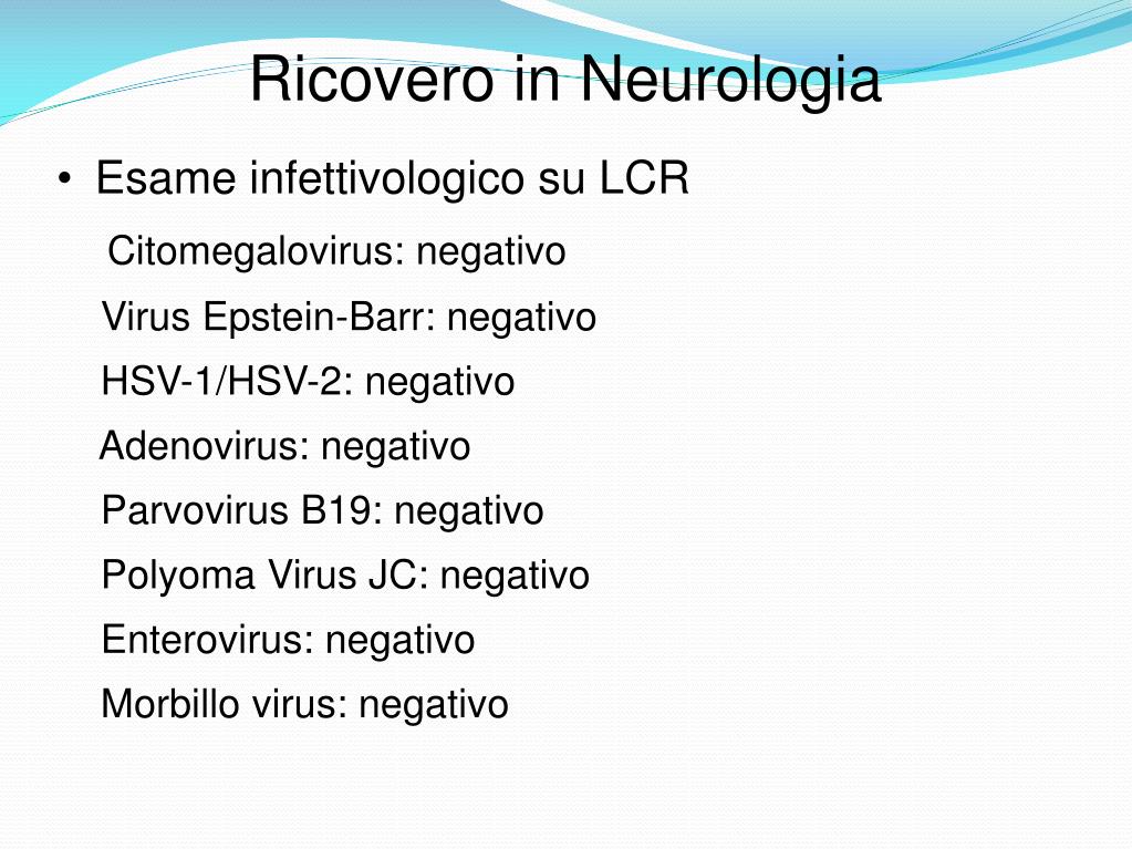 Ricovero in Neurologia • Esame infettivologico su LCR Citomegalovirus: negativo Virus Epstein-Barr: negativo HSV-1/HSV-2: negativo Adenovirus: negativo Parvovirus B19: negativo Polyoma Virus JC: negativo Enterovirus: negativo Morbillo virus: negativo