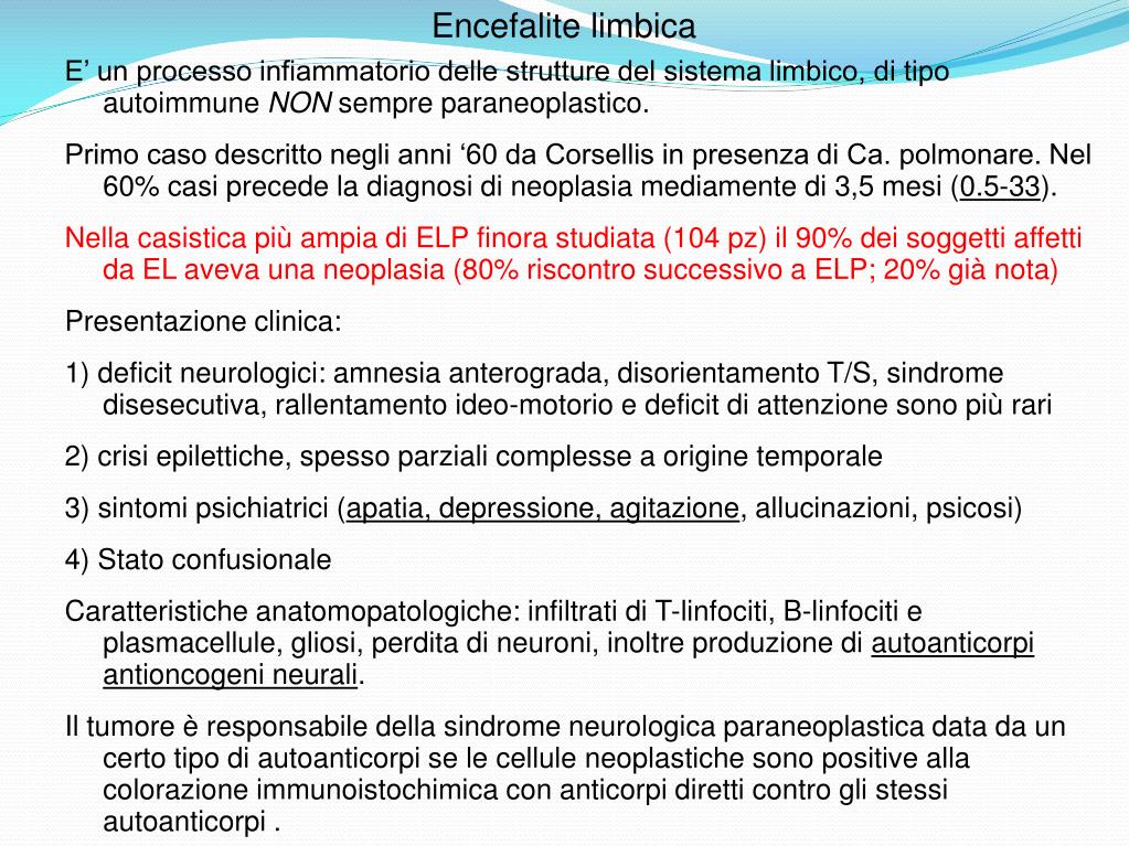 Encefalite limbica E’ un processo infiammatorio delle strutture del sistema limbico, di tipo autoimmune NON sempre paraneoplastico. Primo caso descritto negli anni ‘60 da Corsellis in presenza di Ca. polmonare. Nel 60% casi precede la diagnosi di neoplasia mediamente di 3,5 mesi (0.5-33). Nella casistica più ampia di ELP finora studiata (104 pz) il 90% dei soggetti affetti da EL aveva una neoplasia (80% riscontro successivo a ELP; 20% già nota) Presentazione clinica: 1) deficit neurologici: amnesia anterograda, disorientamento T/S, sindrome disesecutiva, rallentamento ideo-motorio e deficit di attenzione sono più rari 2) crisi epilettiche, spesso parziali complesse a origine temporale 3) sintomi psichiatrici (apatia, depressione, agitazione, allucinazioni, psicosi) 4) Stato confusionale Caratteristiche anatomopatologiche: infiltrati di T-linfociti, B-linfociti e plasmacellule, gliosi, perdita di neuroni, inoltre produzione di autoanticorpi antioncogeni neurali. Il tumore è responsabile della sindrome neurologica paraneoplastica data da un certo tipo di autoanticorpi se le cellule neoplastiche sono positive alla colorazione immunoistochimica con anticorpi diretti contro gli stessi autoanticorpi .