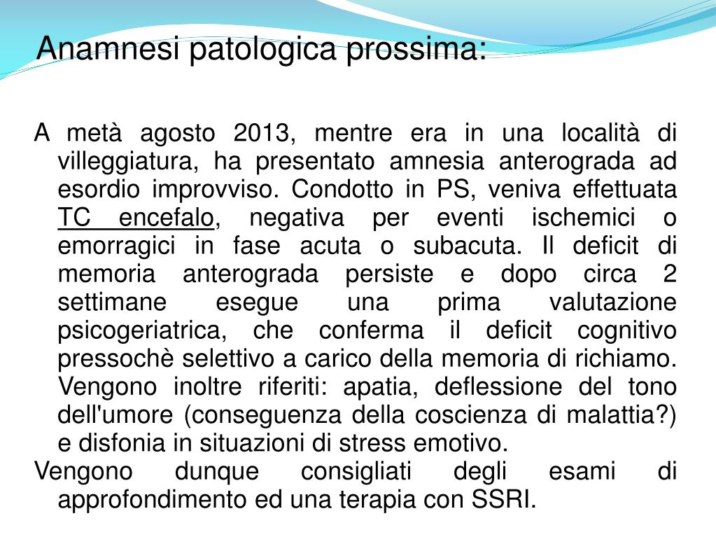 Anamnesi patologica prossima: A metà agosto 2013, mentre era in una località di villeggiatura, ha presentato amnesia anterograda ad esordio improvviso. Condotto in PS, veniva effettuata TC encefalo, negativa per eventi ischemici o emorragici in fase acuta o subacuta. Il deficit di memoria anterograda persiste e dopo circa 2 settimane esegue una prima valutazione psicogeriatrica, che conferma il deficit cognitivo pressochè selettivo a carico della memoria di richiamo. Vengono inoltre riferiti: apatia, deflessione del tono dell'umore (conseguenza della coscienza di malattia?) e disfonia in situazioni di stress emotivo. Vengono dunque consigliati degli esami di approfondimento ed una terapia con SSRI.