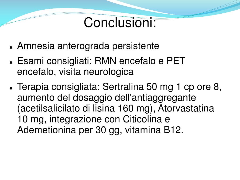 Conclusioni: • Amnesia anterograda persistente • Esami consigliati: RMN encefalo e PET encefalo, visita neurologica • Terapia consigliata: Sertralina 50 mg 1 cp ore 8, aumento del dosaggio dell'antiaggregante (acetilsalicilato di lisina 160 mg), Atorvastatina 10 mg, integrazione con Citicolina e Ademetionina per 30 gg, vitamina B12.