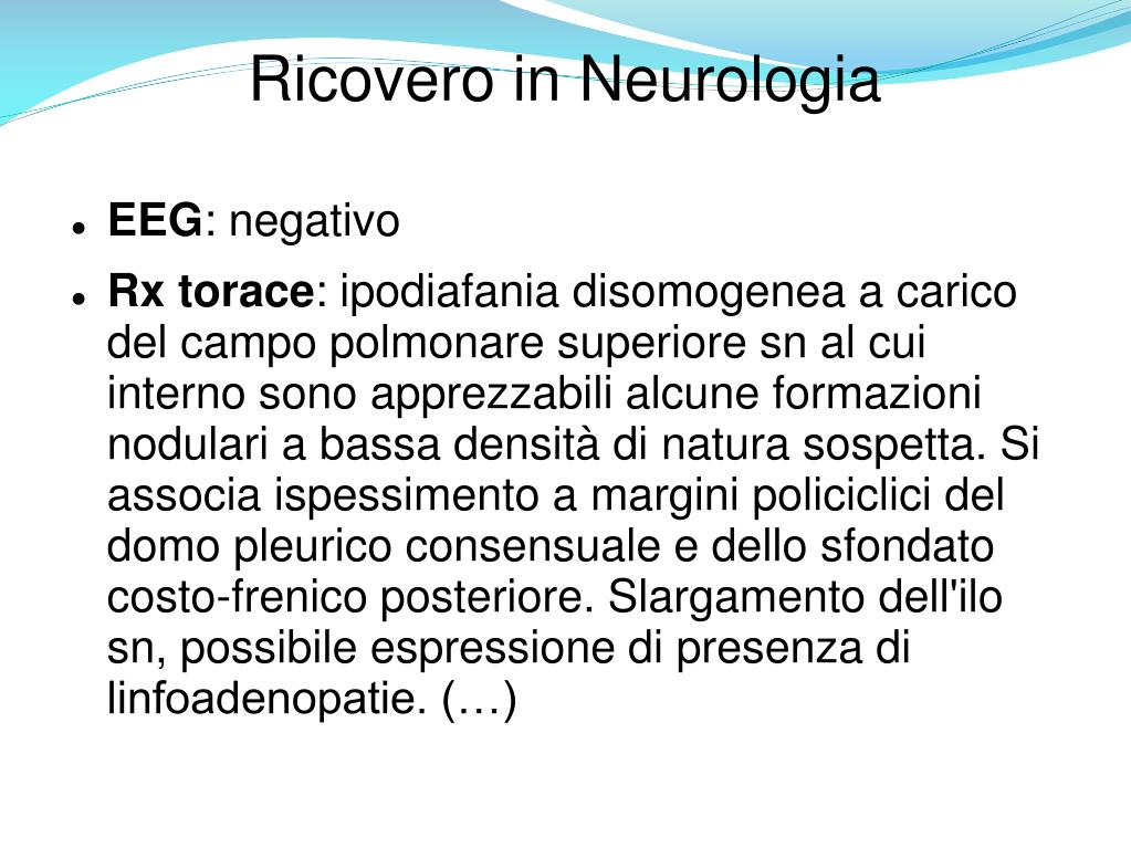 Ricovero in Neurologia • EEG: negativo • Rx torace: ipodiafania disomogenea a carico del campo polmonare superiore sn al cui interno sono apprezzabili alcune formazioni nodulari a bassa densità di natura sospetta. Si associa ispessimento a margini policiclici del domo pleurico consensuale e dello sfondato costo-frenico posteriore. Slargamento dell'ilo sn, possibile espressione di presenza di linfoadenopatie. (…)