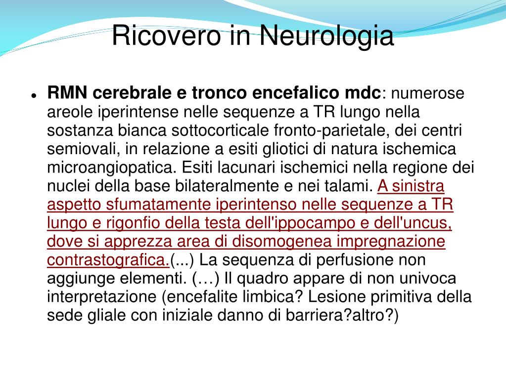 Ricovero in Neurologia • RMN cerebrale e tronco encefalico mdc: numerose areole iperintense nelle sequenze a TR lungo nella sostanza bianca sottocorticale fronto-parietale, dei centri semiovali, in relazione a esiti gliotici di natura ischemica microangiopatica. Esiti lacunari ischemici nella regione dei nuclei della base bilateralmente e nei talami. A sinistra aspetto sfumatamente iperintenso nelle sequenze a TR lungo e rigonfio della testa dell'ippocampo e dell'uncus, dove si apprezza area di disomogenea impregnazione contrastografica.(...) La sequenza di perfusione non aggiunge elementi. (…) Il quadro appare di non univoca interpretazione (encefalite limbica? Lesione primitiva della sede gliale con iniziale danno di barriera?altro?)