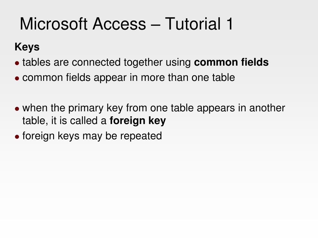 Microsoft Access – Tutorial 1 Keys • tables are connected together using common fields • common fields appear in more than one table • when the primary key from one table appears in another table, it is called a foreign key • foreign keys may be repeated
