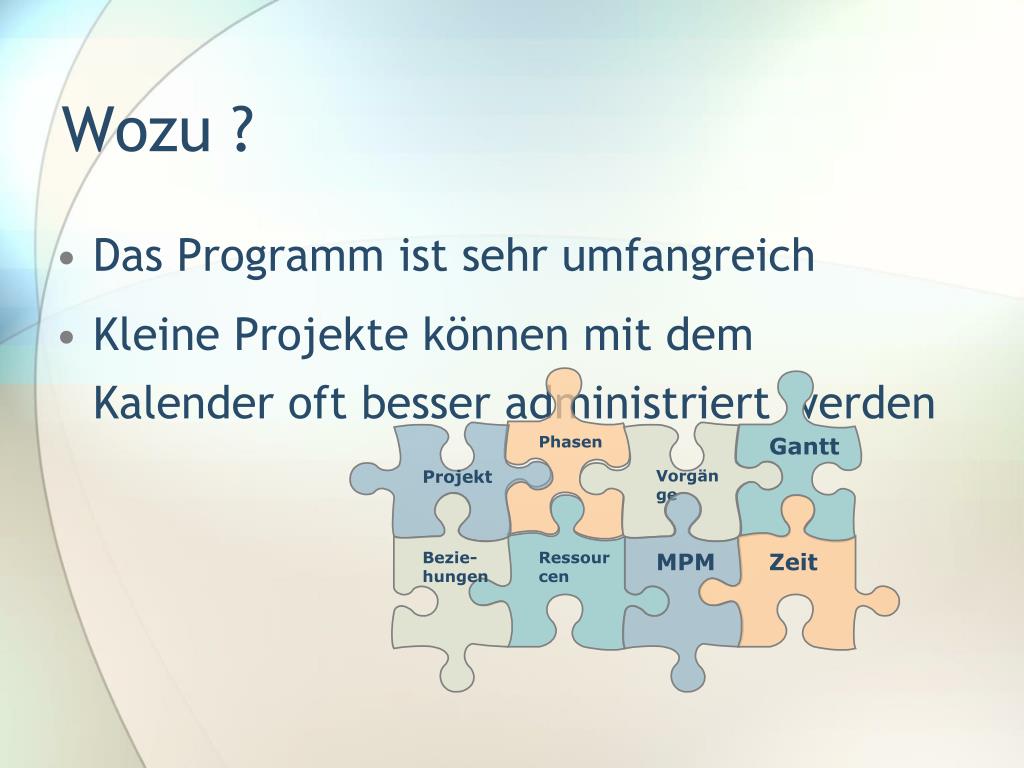 Phasen Gantt Projekt Vorgänge Bezie-hungen Ressourcen MPM Zeit Wozu ? • Das Programm ist sehr umfangreich • Kleine Projekte können mit dem Kalender oft besser administriert werden