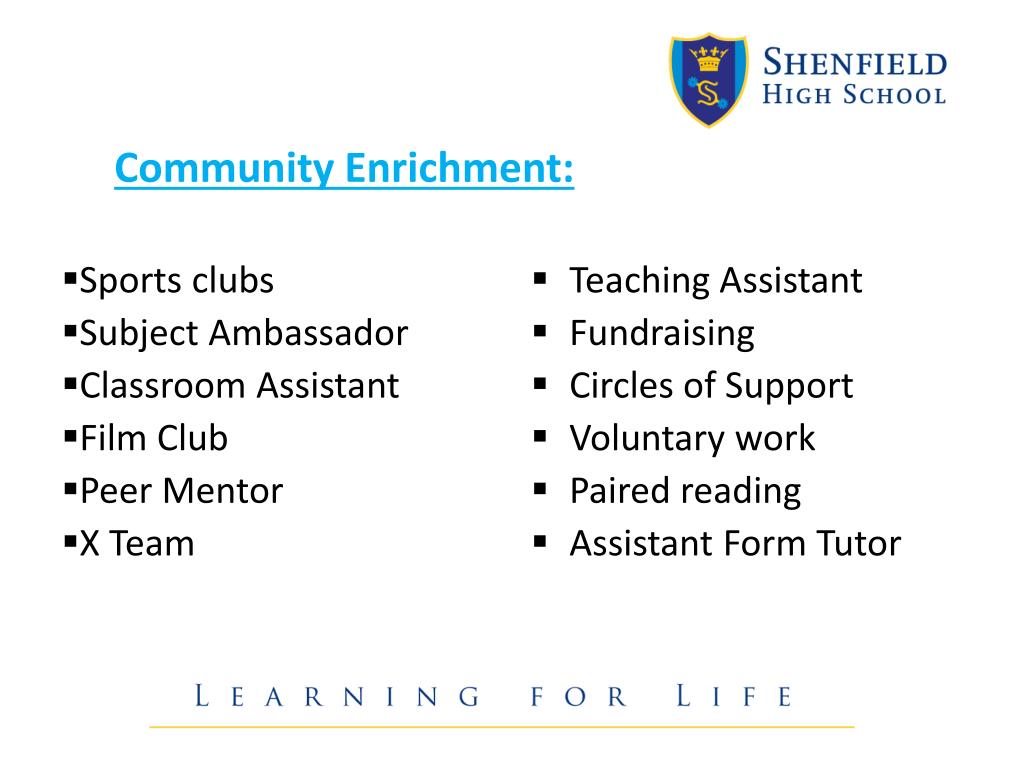 Community Enrichment: Sports clubs Subject Ambassador Classroom Assistant Film Club Peer Mentor X Team • Teaching Assistant • Fundraising • Circles of Support • Voluntary work • Paired reading • Assistant Form Tutor