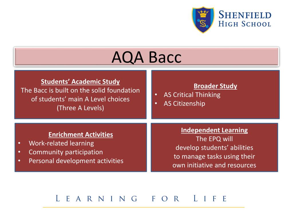AQA Bacc Students’ Academic Study The Bacc is built on the solid foundation of students’ main A Level choices (Three A Levels) • Broader Study • AS Critical Thinking • AS Citizenship • Enrichment Activities • Work-related learning • Community participation • Personal development activities Independent Learning The EPQ will develop students’ abilities to manage tasks using their own initiative and resources