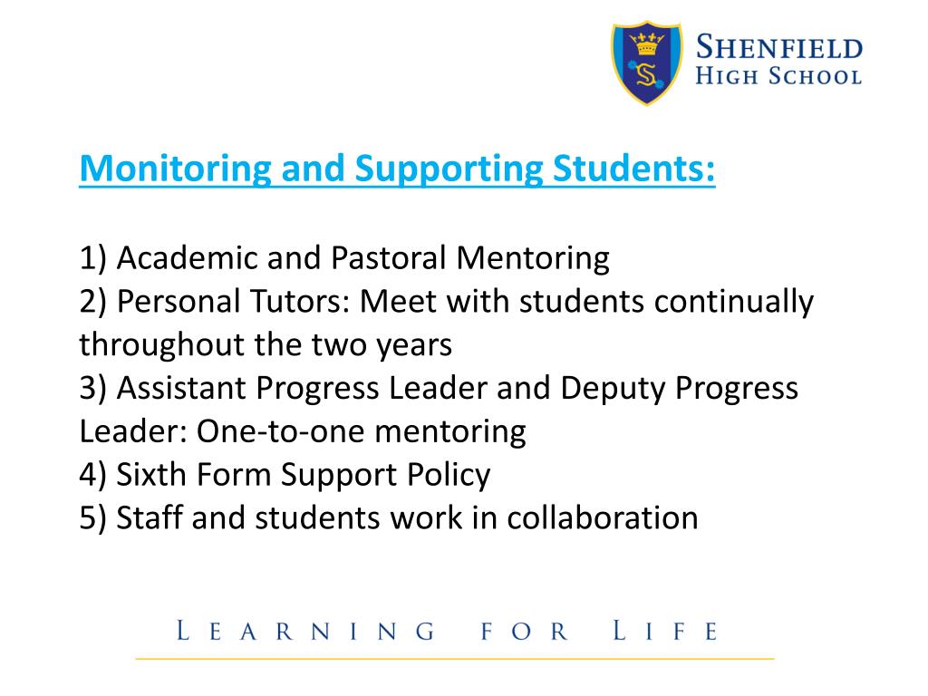 Monitoring and Supporting Students:1) Academic and Pastoral Mentoring2) Personal Tutors: Meet with students continually throughout the two years3) Assistant Progress Leader and Deputy Progress Leader: One-to-one mentoring4) Sixth Form Support Policy5) Staff and students work in collaboration
