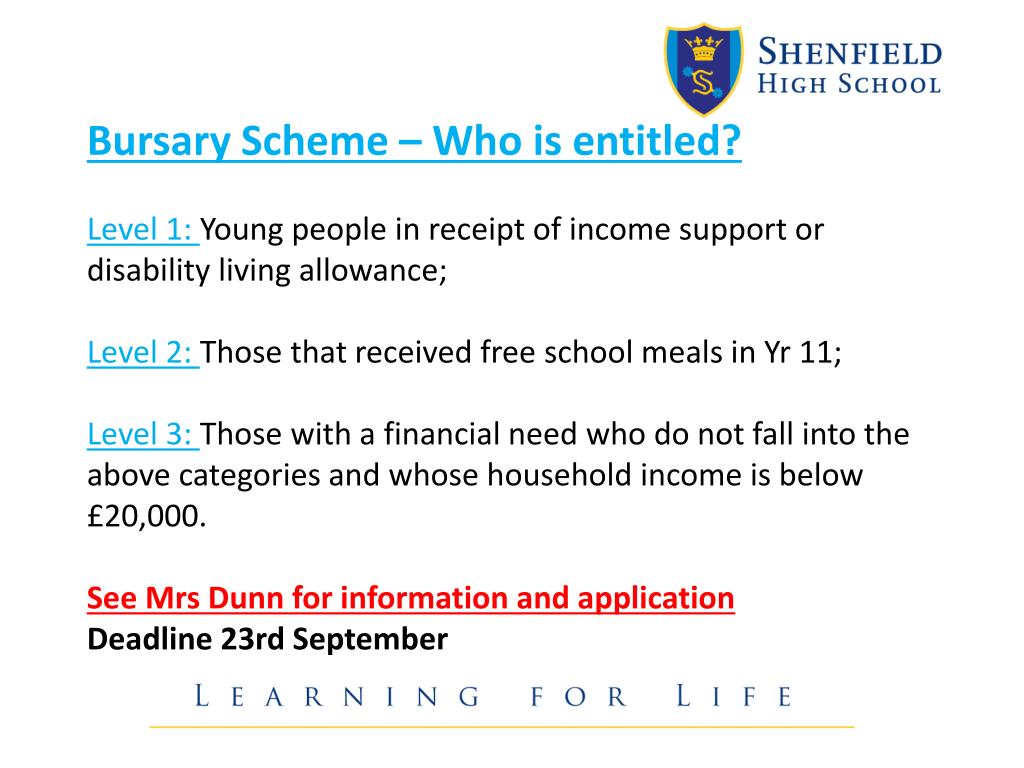 Bursary Scheme – Who is entitled?Level 1: Young people in receipt of income support or disability living allowance;Level 2: Those that received free school meals in Yr11;Level 3: Those with a financial need who do not fall into the above categories and whose household income is below £20,000.See Mrs Dunn for information and applicationDeadline 23rd September