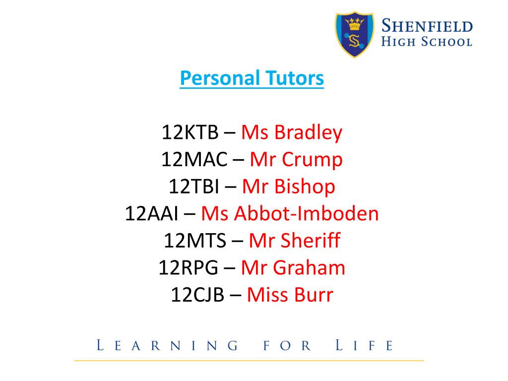 Personal Tutors12KTB – Ms Bradley12MAC – Mr Crump12TBI – Mr Bishop12AAI – Ms Abbot-Imboden12MTS – Mr Sheriff12RPG – Mr Graham12CJB – Miss Burr