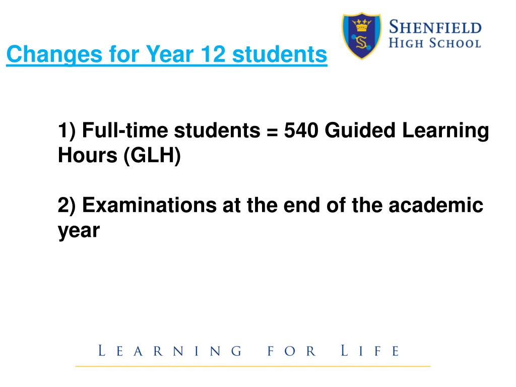 Changes for Year 12 students 1) Full-time students = 540 Guided Learning Hours (GLH) 2) Examinations at the end of the academic year