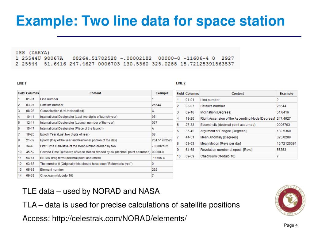 Example: Two line data for space station TLE data – used by NORAD and NASA TLA – data is used for precise calculations of satellite positions Access: http://celestrak.com/NORAD/elements/