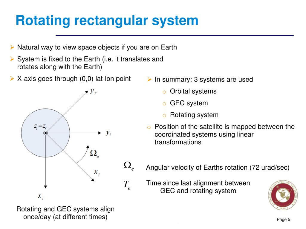 Rotating rectangular system • Natural way to view space objects if you are on Earth • System is fixed to the Earth (i.e. it translates and rotates along with the Earth) • X-axis goes through (0,0) lat-lon point • In summary: 3 systems are used • Orbital systems • GEC system • Rotating system • Position of the satellite is mapped between the coordinated systems using linear transformations Angular velocity of Earths rotation (72 urad/sec) Time since last alignment between GEC and rotating system Rotating and GEC systems align once/day (at different times)