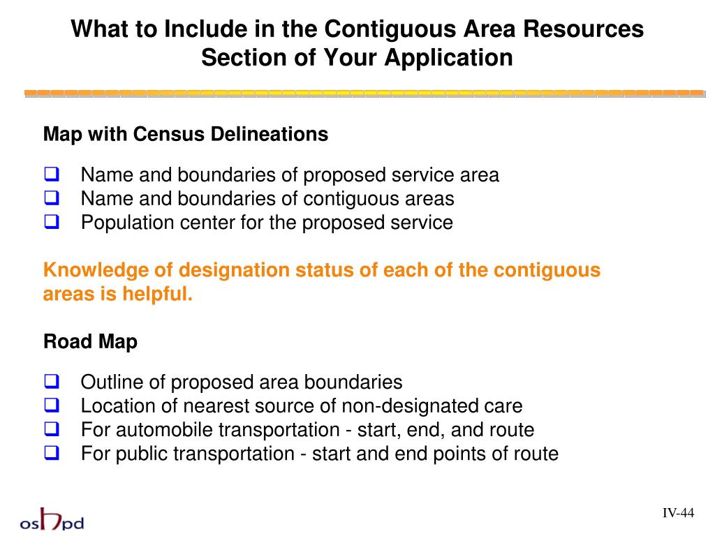 What to Include in the Contiguous Area Resources Section of Your Application -------------------------------------------------- Map with Census Delineations • Name and boundaries of proposed service area • Name and boundaries of contiguous areas • Population center for the proposed service Knowledge of designation status of each of the contiguous areas is helpful. Road Map • Outline of proposed area boundaries • Location of nearest source of non-designated care • For automobile transportation - start, end, and route • For public transportation - start and end points of route IV-44
