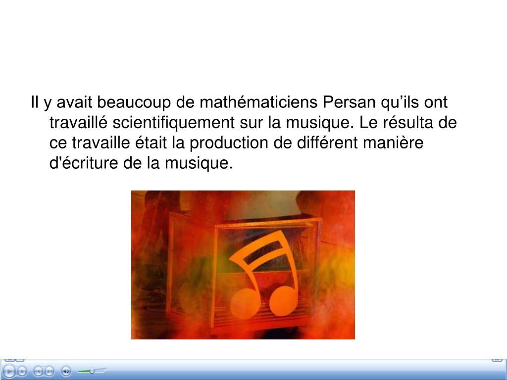 Il y avait beaucoup de mathématiciens Persan qu’ils ont travaillé scientifiquement sur la musique. Le résulta de ce travaille était la production de différent manière d'écriture de la musique.