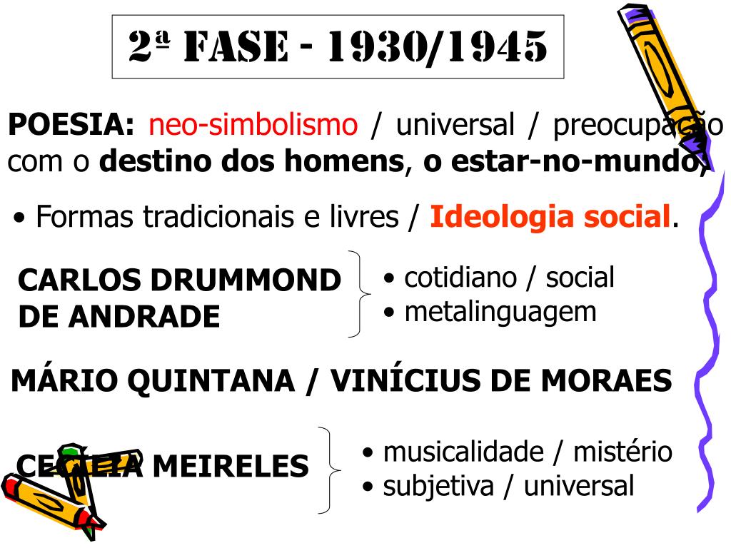 2ª FASE - 1930/1945 POESIA:neo-simbolismo / universal / preocupação com o destino dos homens, o estar-no-mundo; • Formas tradicionais e livres / Ideologia social. • cotidiano / social • metalinguagem CARLOS DRUMMOND DE ANDRADE MÁRIO QUINTANA / VINÍCIUS DE MORAES • musicalidade / mistério • subjetiva / universal CECÍLIA MEIRELES