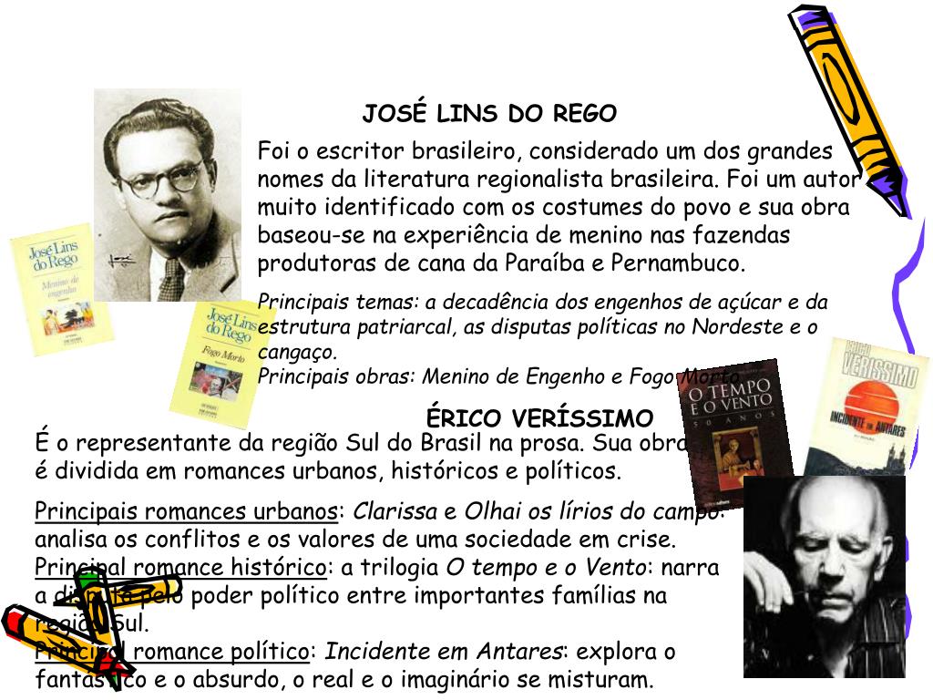 Segunda geração (1930-1945) - Prosa JOSÉ LINS DO REGO Foi o escritor brasileiro, considerado um dos grandes nomes da literatura regionalista brasileira. Foi um autor muito identificado com os costumes do povo e sua obra baseou-se na experiência de menino nas fazendas produtoras de cana da Paraíba e Pernambuco. Principais temas: a decadência dos engenhos de açúcar e da estrutura patriarcal, as disputas políticas no Nordeste e o cangaço. Principais obras: Menino de Engenho e Fogo Morto. ÉRICO VERÍSSIMO É o representante da região Sul do Brasil na prosa. Sua obra é dividida em romances urbanos, históricos e políticos. Principais romances urbanos: Clarissa e Olhai os lírios do campo: analisa os conflitos e os valores de uma sociedade em crise. Principal romance histórico: a trilogia O tempo e o Vento: narra a disputa pelo poder político entre importantes famílias na região Sul. Principal romance político: Incidente em Antares: explora o fantástico e o absurdo, o real e o imaginário se misturam.