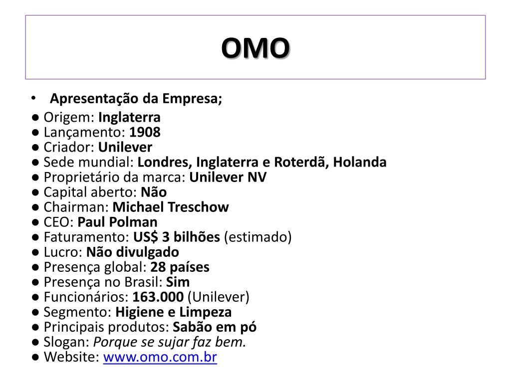 OMO • Apresentação da Empresa; ● Origem: Inglaterra● Lançamento: 1908● Criador: Unilever● Sede mundial: Londres, Inglaterra e Roterdã, Holanda● Proprietário da marca: Unilever NV● Capital aberto: Não ● Chairman: Michael Treschow● CEO: Paul Polman● Faturamento: US$ 3 bilhões (estimado)● Lucro: Não divulgado● Presença global: 28 países● Presença no Brasil: Sim● Funcionários: 163.000 (Unilever)● Segmento: Higiene e Limpeza● Principais produtos: Sabão em pó● Slogan: Porque se sujar faz bem.● Website: www.omo.com.br