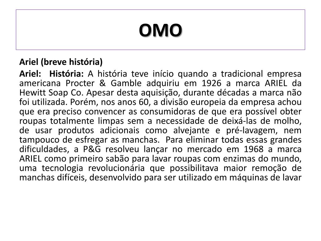 OMO Ariel (breve história) Ariel: História: A história teve início quando a tradicional empresa americana Procter & Gamble adquiriu em 1926 a marca ARIEL da Hewitt SoapCo. Apesar desta aquisição, durante décadas a marca não foi utilizada. Porém, nos anos 60, a divisão europeia da empresa achou que era preciso convencer as consumidoras de que era possível obter roupas totalmente limpas sem a necessidade de deixá-las de molho, de usar produtos adicionais como alvejante e pré-lavagem, nem tampouco de esfregar as manchas. Para eliminar todas essas grandes dificuldades, a P&G resolveu lançar no mercado em 1968 a marca ARIEL como primeiro sabão para lavar roupas com enzimas do mundo, uma tecnologia revolucionária que possibilitava maior remoção de manchas difíceis, desenvolvido para ser utilizado em máquinas de lavar