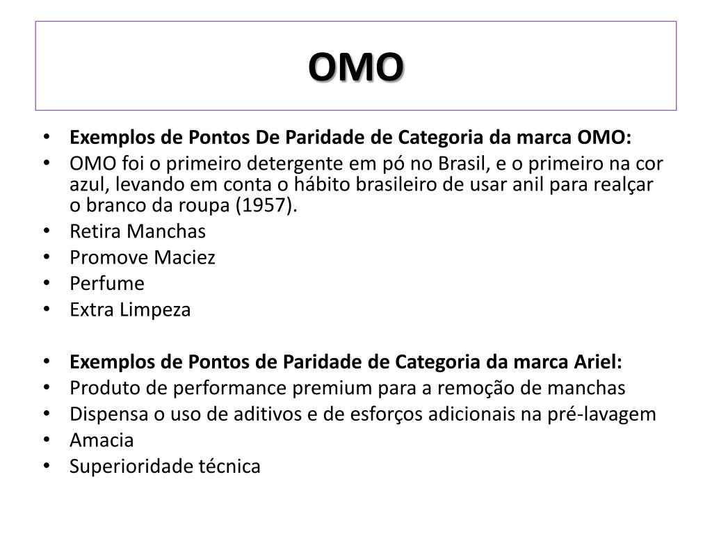 OMO • Exemplos de Pontos De Paridade de Categoria da marca OMO: • OMO foi o primeiro detergente em pó no Brasil, e o primeiro na cor azul, levando em conta o hábito brasileiro de usar anil para realçar o branco da roupa (1957). • Retira Manchas • Promove Maciez • Perfume • Extra Limpeza • Exemplos de Pontos de Paridade de Categoria da marca Ariel: • Produto de performance premium para a remoção de manchas • Dispensa o uso de aditivos e de esforços adicionais na pré-lavagem • Amacia • Superioridade técnica