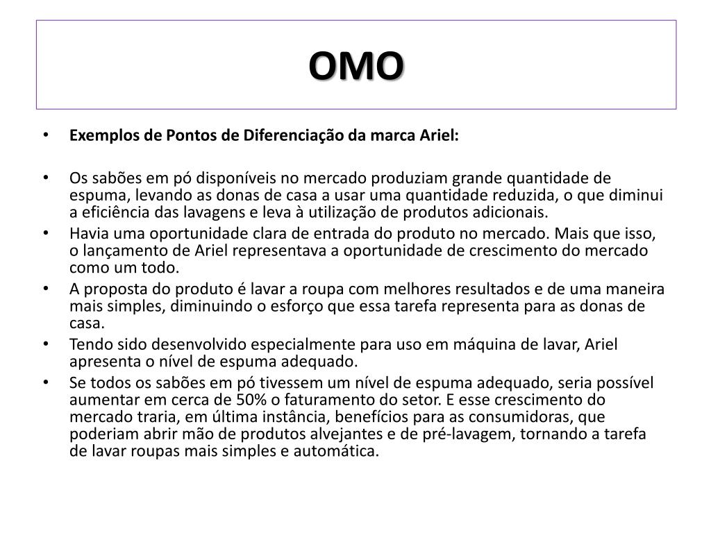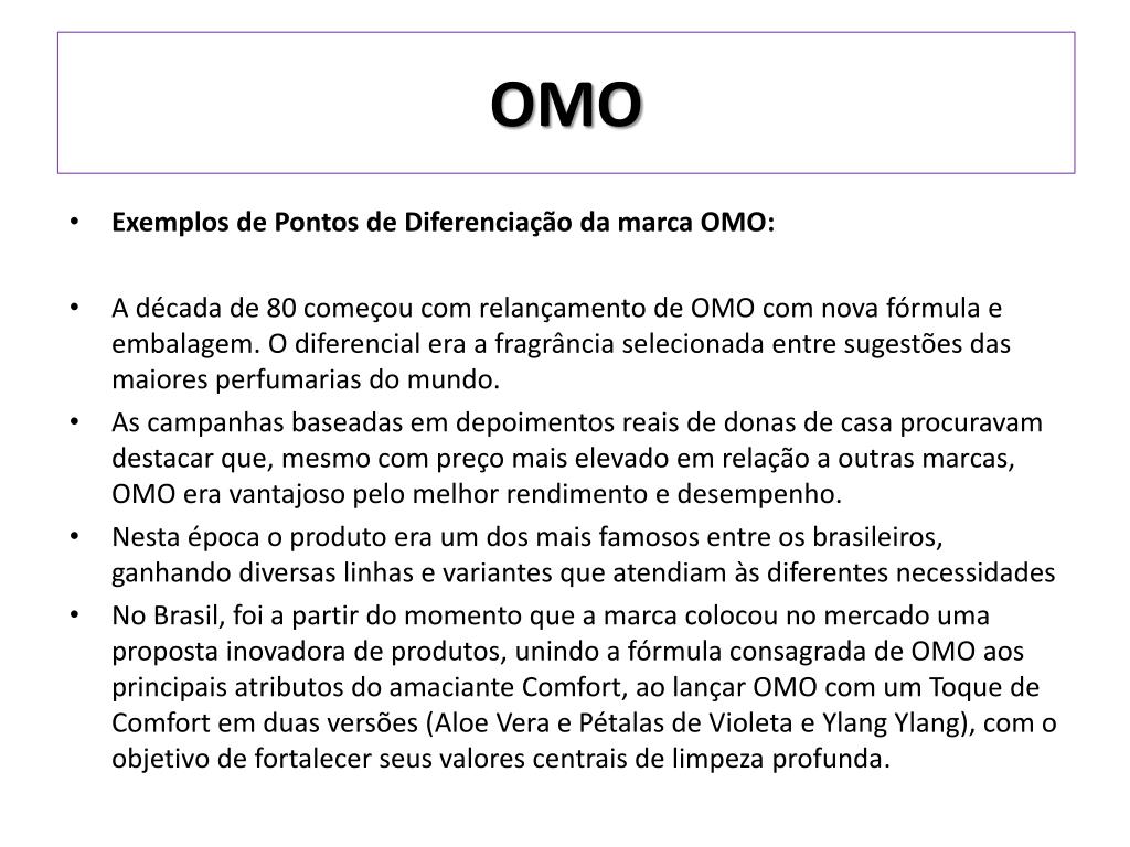 OMO • Exemplos de Pontos de Diferenciação da marca OMO: • A década de 80 começou com relançamento de OMO com nova fórmula e embalagem. O diferencial era a fragrância selecionada entre sugestões das maiores perfumarias do mundo. • As campanhas baseadas em depoimentos reais de donas de casa procuravam destacar que, mesmo com preço mais elevado em relação a outras marcas, OMO era vantajoso pelo melhor rendimento e desempenho. • Nesta época o produto era um dos mais famosos entre os brasileiros, ganhando diversas linhas e variantes que atendiam às diferentes necessidades • No Brasil, foi a partir do momento que a marca colocou no mercado uma proposta inovadora de produtos, unindo a fórmula consagrada de OMO aos principais atributos do amaciante Comfort, ao lançar OMO com um Toque de Comfort em duas versões (Aloe Vera e Pétalas de Violeta e YlangYlang), com o objetivo de fortalecer seus valores centrais de limpeza profunda.