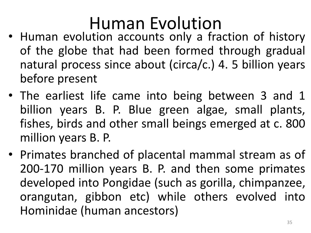 Human Evolution • Human evolution accounts only a fraction of history of the globe that had been formed through gradual natural process since about (circa/c.) 4. 5 billion years before present • The earliest life came into being between 3 and 1 billion years B. P. Blue green algae, small plants, fishes, birds and other small beings emerged at c. 800 million years B. P. • Primates branched of placental mammal stream as of 200-170 million years B. P. and then some primates developed into Pongidae (such as gorilla, chimpanzee, orangutan, gibbon etc) while others evolved into Hominidae (human ancestors)