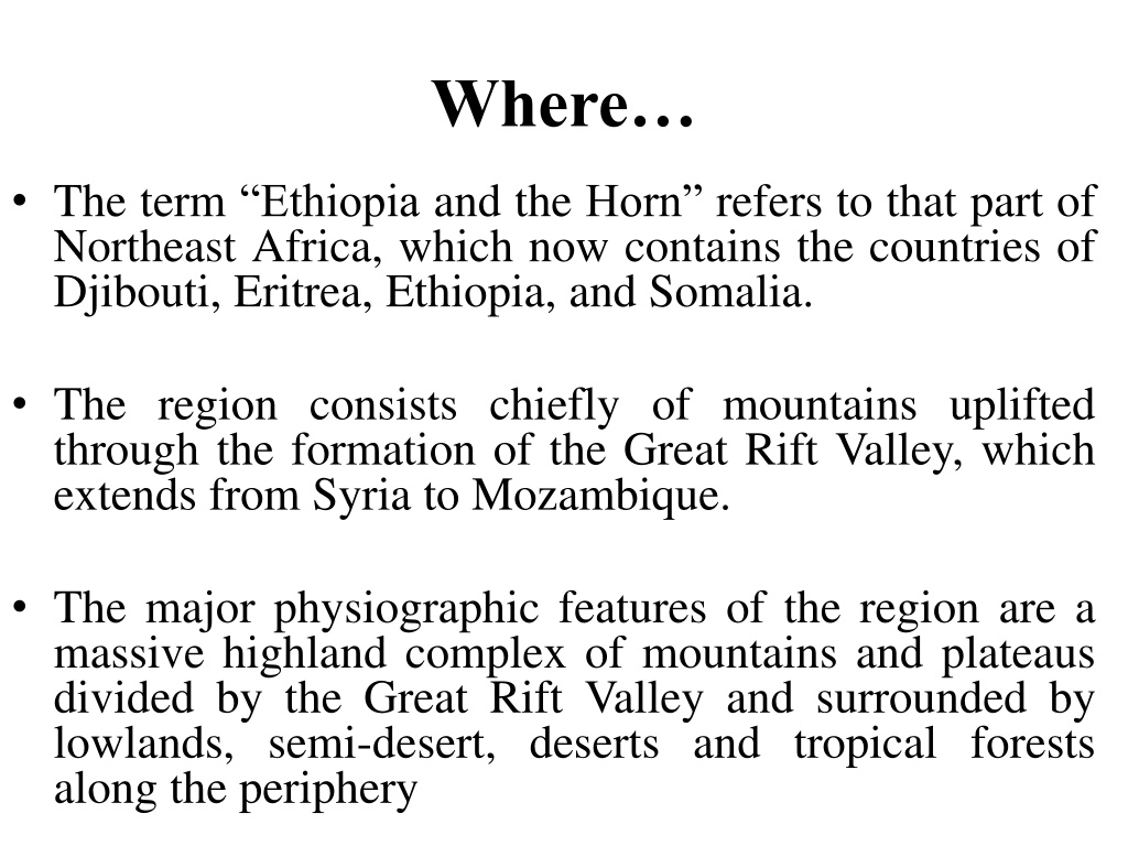 Where… • The term “Ethiopia and the Horn” refers to that part of Northeast Africa, which now contains the countries of Djibouti, Eritrea, Ethiopia, and Somalia. • The region consists chiefly of mountains uplifted through the formation of the Great Rift Valley, which extends from Syria to Mozambique. • The major physiographic features of the region are a massive highland complex of mountains and plateaus divided by the Great Rift Valley and surrounded by lowlands, semi-desert, deserts and tropical forests along the periphery