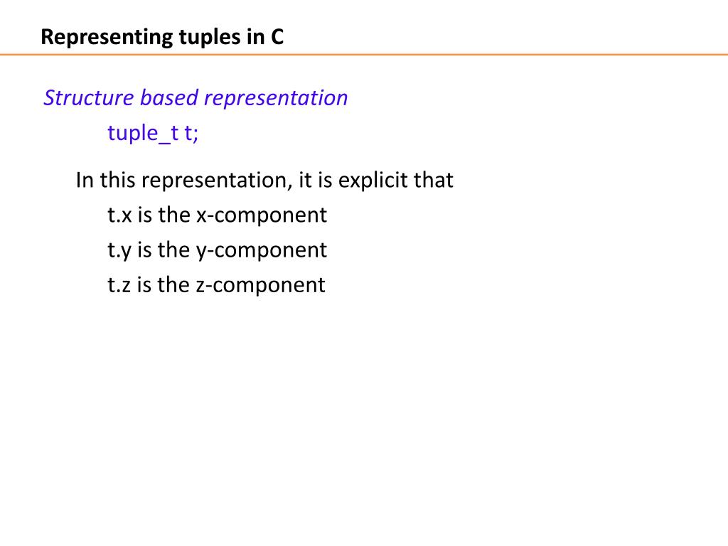 Representing tuples in C Structure based representation tuple_t t; In this representation, it is explicit that t.xis the x-component t.yis the y-component t.zis the z-component