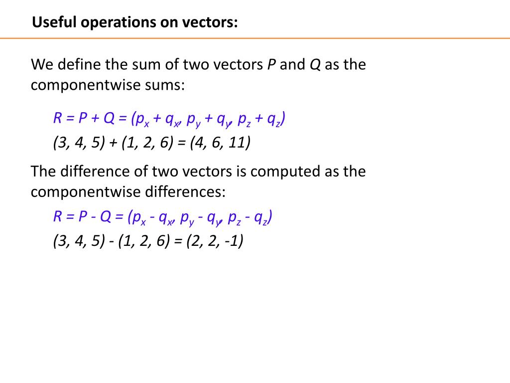 Useful operations on vectors: We define the sum of two vectors P and Q as the componentwise sums: R = P + Q = (px + qx, py + qy, pz + qz) (3, 4, 5) + (1, 2, 6) = (4, 6, 11) The difference of two vectors is computed as the componentwise differences: R = P - Q = (px - qx, py - qy, pz - qz) (3, 4, 5) - (1, 2, 6) = (2, 2, -1)