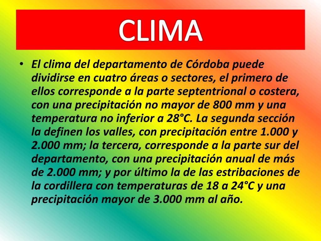 CLIMA • El clima del departamento de Córdoba puede dividirse en cuatro áreas o sectores, el primero de ellos corresponde a la parte septentrional o costera, con una precipitación no mayor de 800 mm y una temperatura no inferior a 28°C. La segunda sección la definen los valles, con precipitación entre 1.000 y 2.000 mm; la tercera, corresponde a la parte sur del departamento, con una precipitación anual de más de 2.000 mm; y por último la de las estribaciones de la cordillera con temperaturas de 18 a 24°C y una precipitación mayor de 3.000 mm al año.