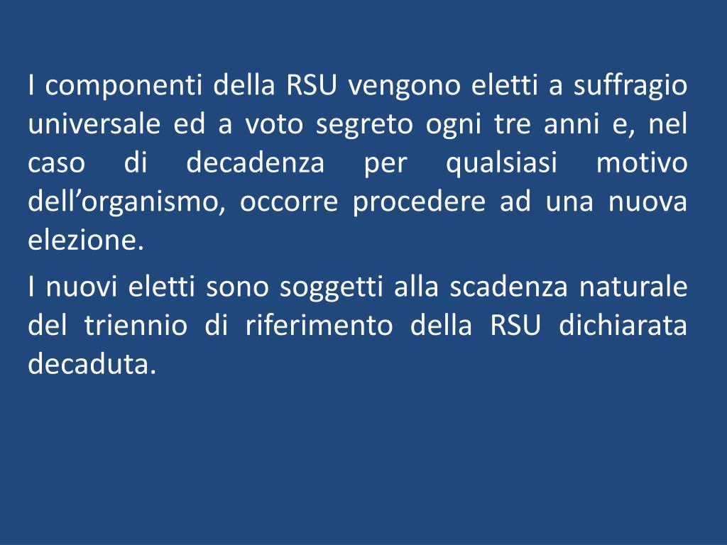 I componenti della RSU vengono eletti a suffragio universale ed a voto segreto ogni tre anni e, nel caso di decadenza per qualsiasi motivo dell’organismo, occorre procedere ad una nuova elezione. I nuovi eletti sono soggetti alla scadenza naturale del triennio di riferimento della RSU dichiarata decaduta.