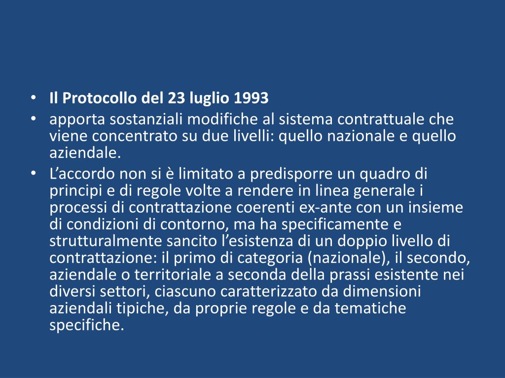 Il Protocollo del 23 luglio 1993 • apporta sostanziali modifiche al sistema contrattuale che viene concentrato su due livelli: quello nazionale e quello aziendale. • L’accordo non si è limitato a predisporre un quadro di principi e di regole volte a rendere in linea generale i processi di contrattazione coerenti ex-ante con un insieme di condizioni di contorno, ma ha specificamente e strutturalmente sancito l’esistenza di un doppio livello di contrattazione: il primo di categoria (nazionale), il secondo, aziendale o territoriale a seconda della prassi esistente nei diversi settori, ciascuno caratterizzato da dimensioni aziendali tipiche, da proprie regole e da tematiche specifiche.