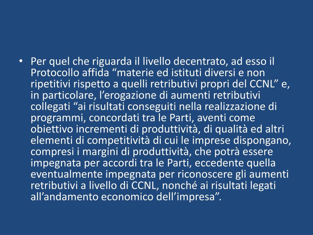 Per quel che riguarda il livello decentrato, ad esso il Protocollo affida “materie ed istituti diversi e non ripetitivi rispetto a quelli retributivi propri del CCNL” e, in particolare, l’erogazione di aumenti retributivi collegati “ai risultati conseguiti nella realizzazione di programmi, concordati tra le Parti, aventi come obiettivo incrementi di produttività, di qualità ed altri elementi di competitività di cui le imprese dispongano, compresi i margini di produttività, che potrà essere impegnata per accordi tra le Parti, eccedente quella eventualmente impegnata per riconoscere gli aumenti retributivi a livello di CCNL, nonché ai risultati legati all’andamento economico dell’impresa”.