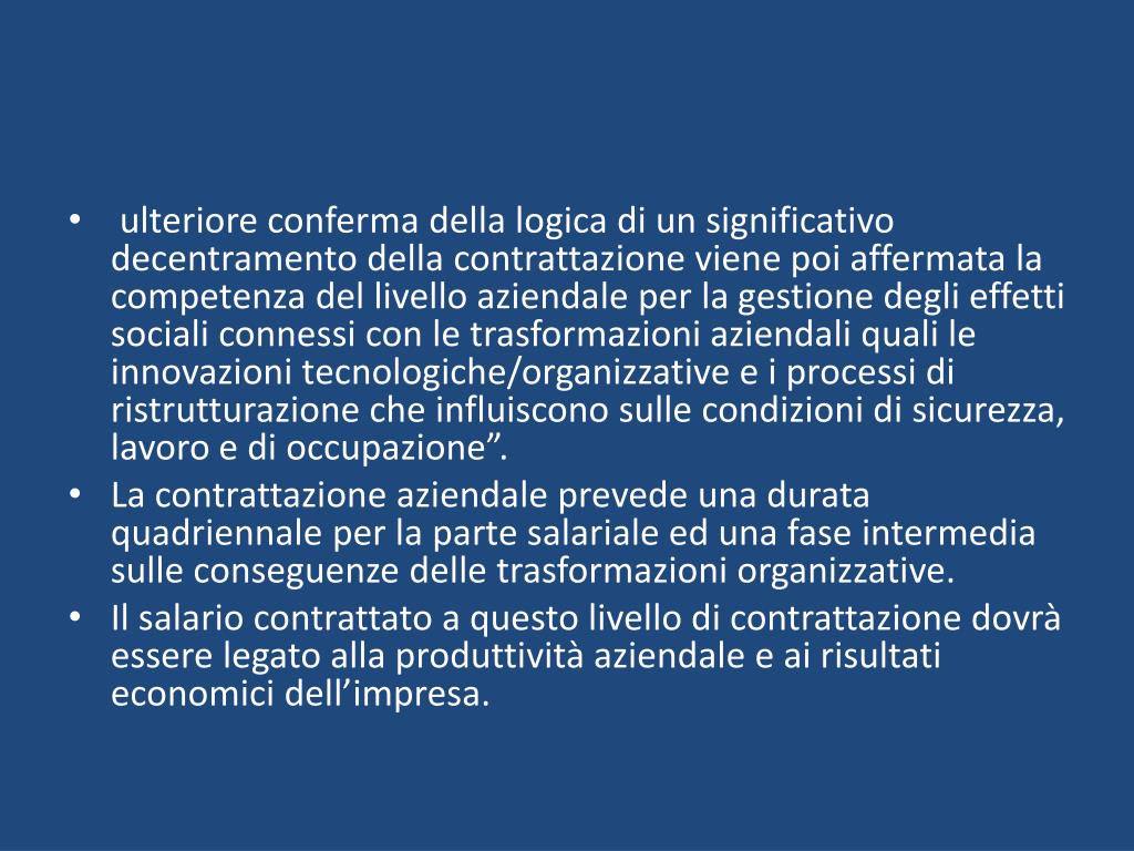 ulteriore conferma della logica di un significativo decentramento della contrattazione viene poi affermata la competenza del livello aziendale per la gestione degli effetti sociali connessi con le trasformazioni aziendali quali le innovazioni tecnologiche/organizzative e i processi di ristrutturazione che influiscono sulle condizioni di sicurezza, lavoro e di occupazione”. • La contrattazione aziendale prevede una durata quadriennale per la parte salariale ed una fase intermedia sulle conseguenze delle trasformazioni organizzative. • Il salario contrattato a questo livello di contrattazione dovrà essere legato alla produttività aziendale e ai risultati economici dell’impresa.