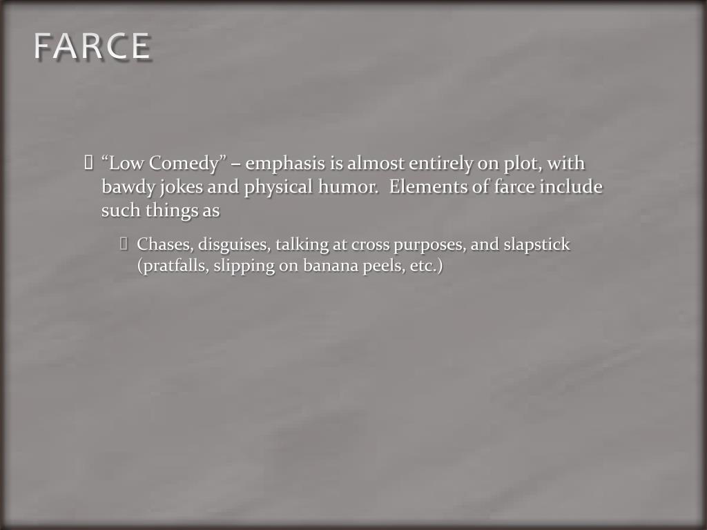 FARCE • “Low Comedy” – emphasis is almost entirely on plot, with bawdy jokes and physical humor. Elements of farce include such things as • Chases, disguises, talking at cross purposes, and slapstick (pratfalls, slipping on banana peels, etc.)