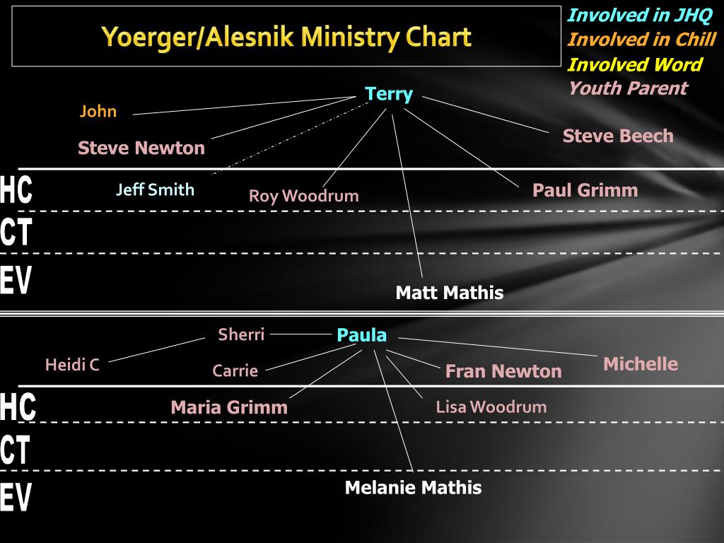 Involved in JHQ Yoerger/Alesnik Ministry Chart Involved in Chill Involved Word Youth Parent Terry John Steve Beech Steve Newton HC Jeff Smith Paul Grimm Roy Woodrum CT EV Matt Mathis Sherri Paula Michelle Heidi C Carrie Fran Newton HC Maria Grimm Lisa Woodrum CT Melanie Mathis EV