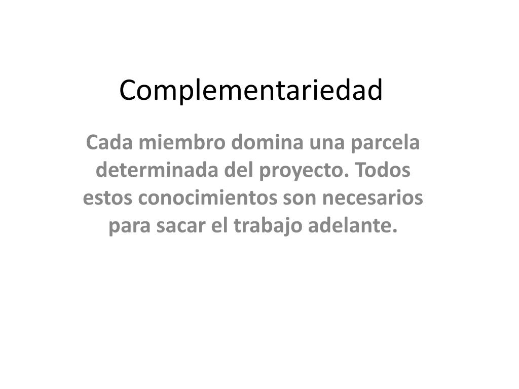 Complementariedad Cada miembro domina una parcela determinada del proyecto. Todos estos conocimientos son necesarios para sacar el trabajo adelante.